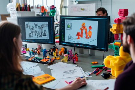Two designers engage in a collaborative process within a lively studio, surrounded by sketches and vivid 3D printed models, while digital screens showcase their imaginative creations.