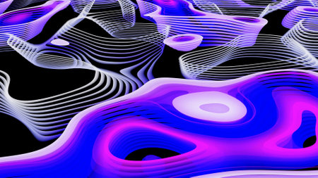 Abstract background of topographic map concept. Contour map stripes. Valleys and mountains. Geography concept. Wavy backdrop. Magic neon light curved swirl line. 3D illustration