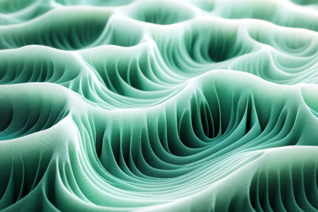 An image of a serene, textured landscape with a pattern that resembles wavy, undulating hills in a monotone green hue, AI generated image