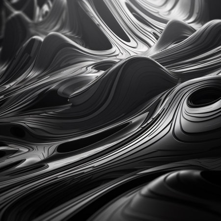 A dynamic monochrome abstract sculpture with a smooth, metallic sheen, resembling a flowing wave or twisted ribbon,...