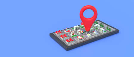 Map pointer location red color pin on a town plan on a smartphone screen, blue background. Navigation, GPS mobile phone app concept, copy space, template. 3d illustration