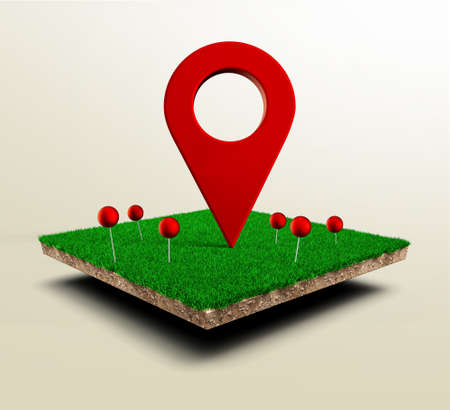 Red pushpin, navigation symbol. Red navigator pin on Square of green grass field 3d illustration