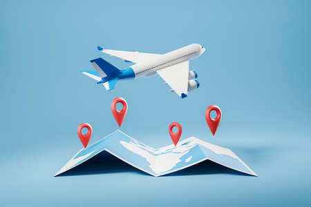 White airplane flying worldwide, paper map with location pins on blue background. Concept of travel and tourism. 3D rendering