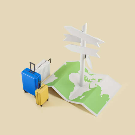 Top view of colorful suitcases, world paper map and blank direction signs. Concept of destination, road pointer and choice. Mockup copy space, 3D rendering