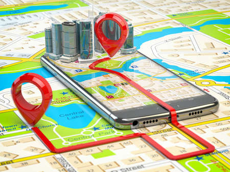 GPS navigation concept. Smartphone app with skyscrapers and two pins with route on city map. 3d illustration