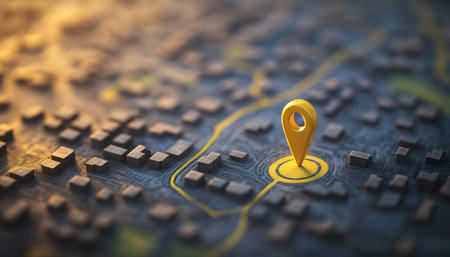 Realistic photograph of an abstract city map featuring a yellow location pin on the street