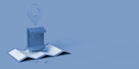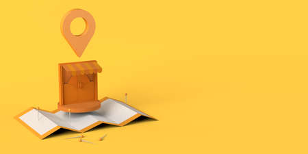 Location concept with locator mark, map and store. 3D illustration. Copy space.