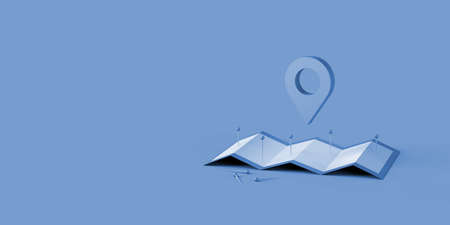 Map and pin pointer location, search travel navigation GPS concept. Minimal paper map and orange color navigator locator position point on blue background. 3d illustration