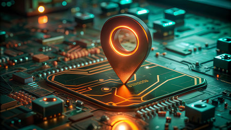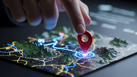 A hand points to a glowing red GPS pin on a futuristic digital map with illuminated routes.