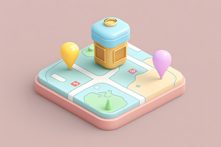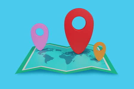 Abstract location map featuring red and blue pins on a digital background with bokeh effect
