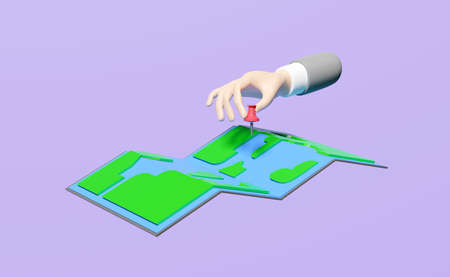 3d businessman hands holding pin with map isolated on purple. abstract background, map earth travel concept, 3d render illustration