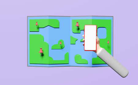 3d illustration of mobile phone with travel map and location pin.