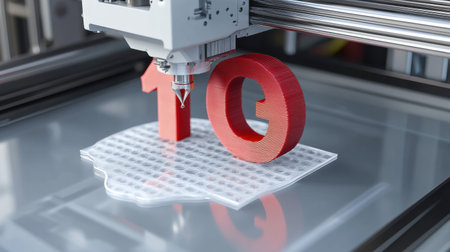 A detailed view of a 3D printer working on creating a red number ten on a transparent surface. This scene showcases modern technology and innovation in manufacturing.