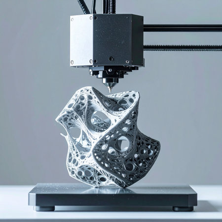 A state-of-the-art 3D printer meticulously constructs an intricate, organic sculpture layer by layer.