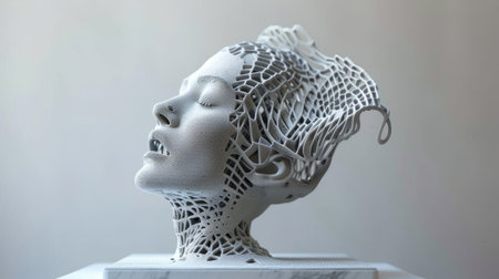 A 3D printed bust of a woman with a complex lattice structure design, combining modern technology and classical art in a monochromatic palette.