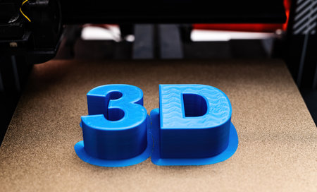 3D Printer Printing Process Of 3D Sign With Blue Color