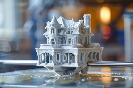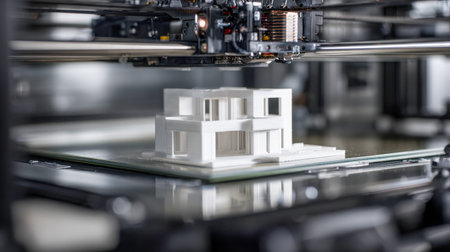 A sleek, contemporary design studio showcases a detailed architectural prototype emerging from a cutting-edge 3d printing device, emphasizing innovation and precisio