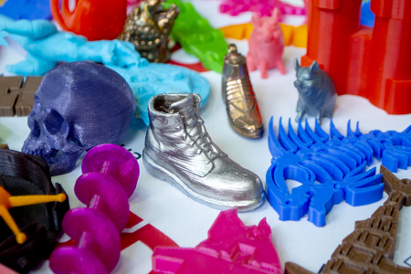 Models printed by 3d printer. Bright colorful objects printed on a 3d printer on a table close-up. Fused deposition modeling, FDM. Concept modern progressive additive technology for 3d printing.