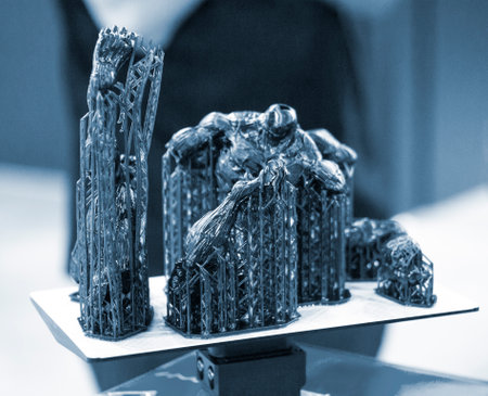 Black model with supports printed on 3D printer close-up. Part of object created on 3D printer from hardened rubber under influence of ultraviolet light. SLA 3D printing technology. Stereolithography