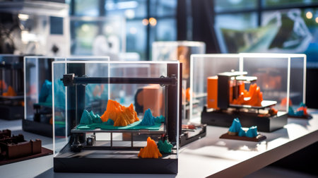 3d printer creating colorful plastic model in modern workshop