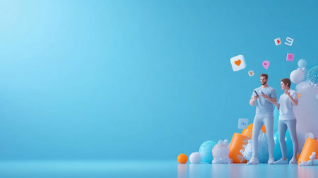 A conceptual illustration of two people interacting with technology and social media elements against a blue background.