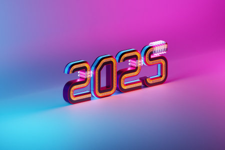 Happy New Year 2025. Volumetric multi-colored Numbers of 2025. Trendy Christmas background. Realistic 3d illustration