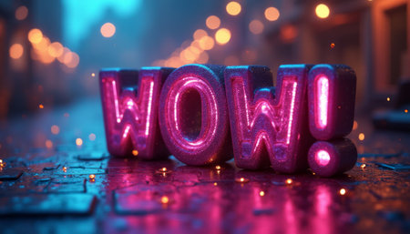A dazzling WOW sign glimmers in vibrant pink hues, set against a wet, reflective street illuminated by soft, glowing lights. This captivating scene evokes a sense of excitement and wonder, inviting viewers to embrace the magic of the moment.