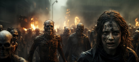 A dystopian apocalypse fantasy scene featuring a horde of menacing zombies slowly walking towards an uncertain target.Generated with AI