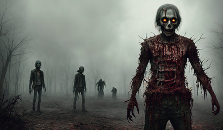 Creepy Halloween background. Scary zombies in the dark forest.