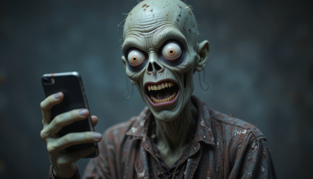 A zombie completely absorbed in a smartphone, symbolizing addiction and brainrot. A powerful concept illustrating dependence on social media and technology, highlighting the impact of modern digital distractions.