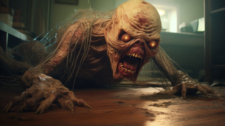 a zombie with big eyes and teeth is depicted in this hyper-realistic photo. the redshift effect adds a brutal action vibe, while the detailed anatomy showcases the artist's skill. the yankeecore theme is evident through the heavy impasto technique used, creating a close-up view that intensifies the eerie atmosphere. ai generated