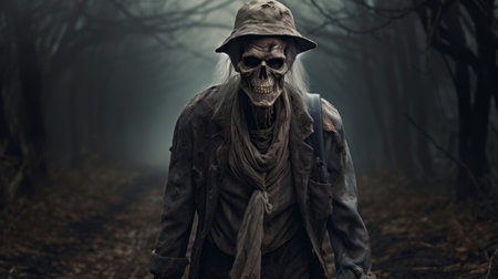 a ghostly figure of a scary man emerges from the dense fog, wandering through the mysterious woods. cloaked in a detailed costume adorned with skull motifs, this hyperrealistic fantasy image captivates. the atmosphere evokes a romanticized country life, adding to the sense of intrigue. as the mist swirls around, the creased, crinkled, and wrinkled elements lend an eerie depth to the scene. ai generated