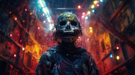 a close-up photo of a horror-themed zombie costume featuring a skinned man engulfed in flames and illuminated by vibrant lights. the image is rendered in the style of unreal engine, with a dieselpunk aesthetic. the shot is taken through a rangefinder lens, capturing the essence of grandparentcore and suburban ennui. this concept art beautifully captures the eerie and captivating essence of the subject. ai generated