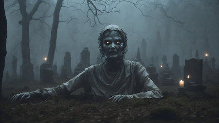 An AI generated illustration of a scary female figure in a foggy cemetery