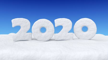 2020 Happy New Year sign text written with numbers made of snow on snowy field under clear blue night sky, snowy winter 3d illustration landscape