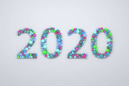 Illustration with numbers 2020 of upcoming New Year event. Letters filled with little bubbles shiny randomly colored spheres. 3d illustration.