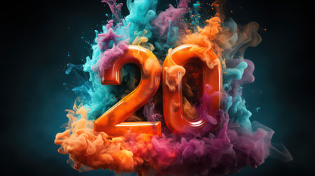 Close-up image of the number twenty, rendered in a 3D design style, with a textured metallic appearance and vibrant orange and purple hues. Water droplets and sparks add a dynamic, glowing effect to the image.