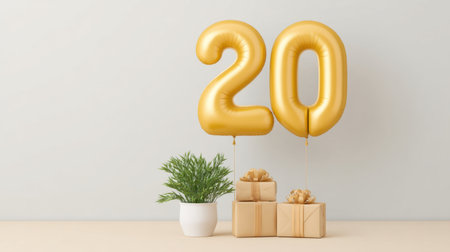 Celebrate a special moment with this elegant arrangement featuring golden number twenty balloons, elegant gifts, and a stylish plant, perfect for birthdays or anniversaries.
