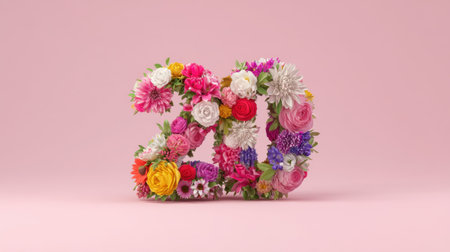 This image features a creative floral arrangement shaped like the number 20, adorned with a variety of vibrant flowers against a soft pink background, perfect for celebrations.