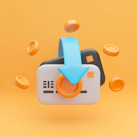 3d cashback credit card icon. Realistic bank card with golden coins and blue arrows around. Money return, cashback and transfer concept. Vector sign of cash service on yellow background