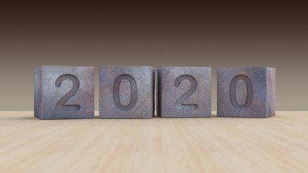 3d rendering image of 2020 wooden cubes placed on the wooden floor.