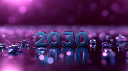 2030 in Polished Metallic Style on a Burgundy Background with Bokeh Effect and Water Droplets