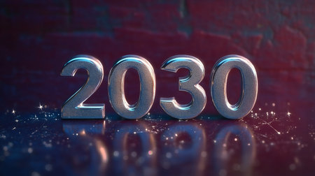 Shiny Chrome Date Number 2030 with Reflections, Metallic Background for New Year Celebration