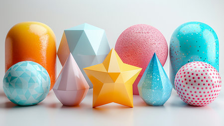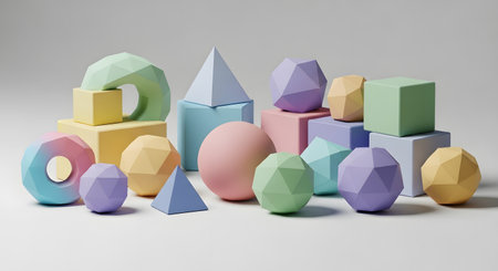 This image showcases a diverse assortment of 3D geometric shapes in various pastel colors, including spheres, cubes, pyramids, and other polyhedrons, arranged in a visually appealing manner, ideal for educational purposes and children's learning activities.