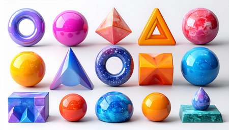 A collection of translucent geometric shapes including cubes, spheres, and prisms in pastel colors, floating in a...