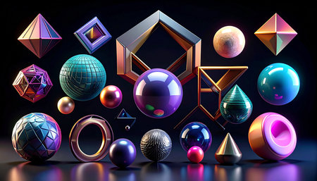 A collection of various 3D geometric shapes like spheres, pyramids, cubes, and prisms scattered on a gradient surface.