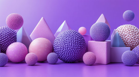 A collection of various geometric shapes in purple hues stands against a gradient pink and purple backdrop, creating an abstract and modern visual composition.