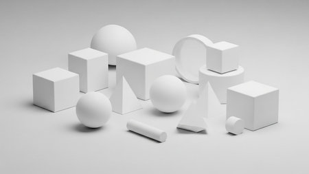 A collection of various white geometric 3D shapes like cubes, spheres, and pyramids, arranged on a plain surface.
