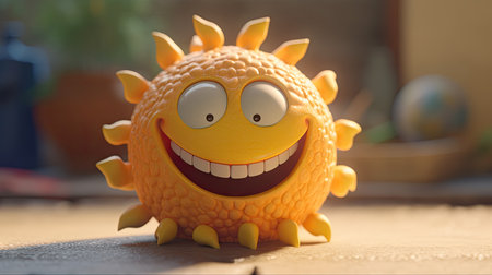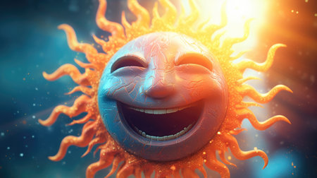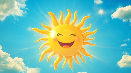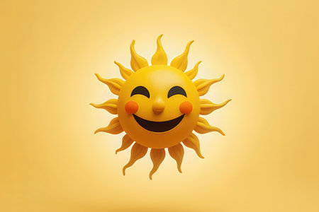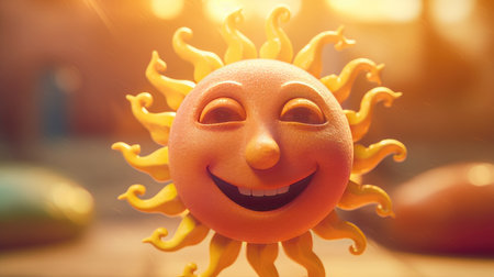 Cheerful sun with bright yellow and orange rays radiating happiness in a playful art style