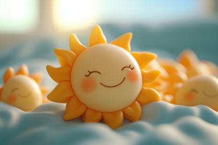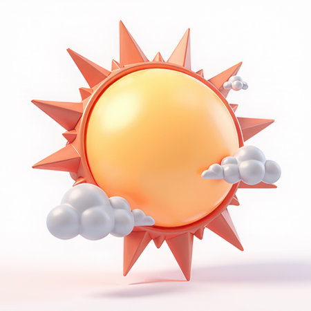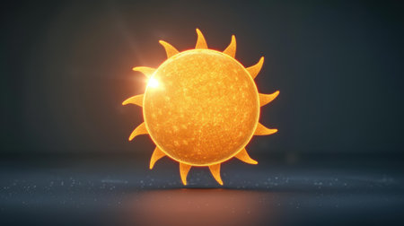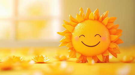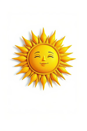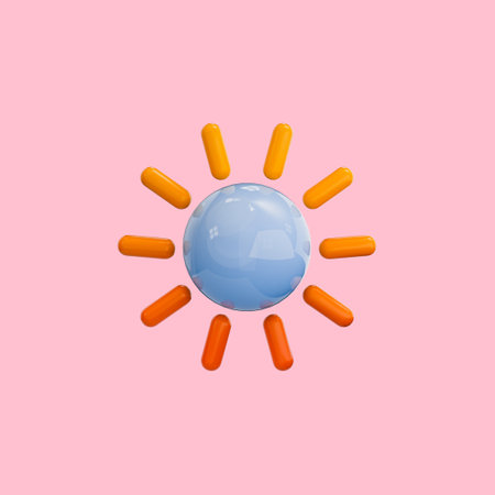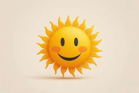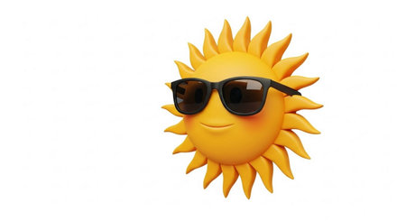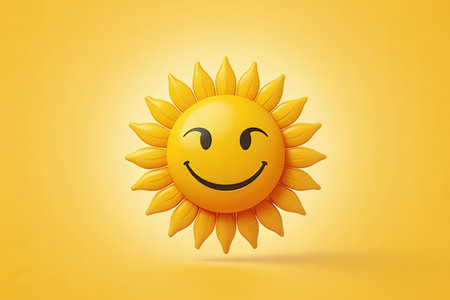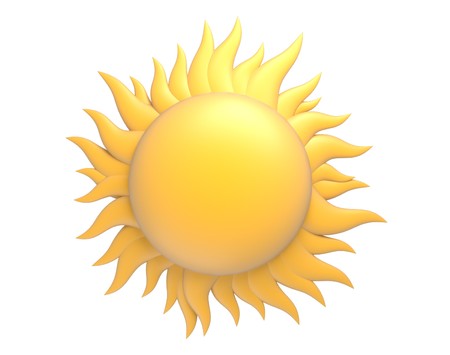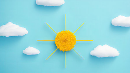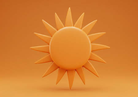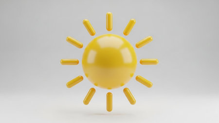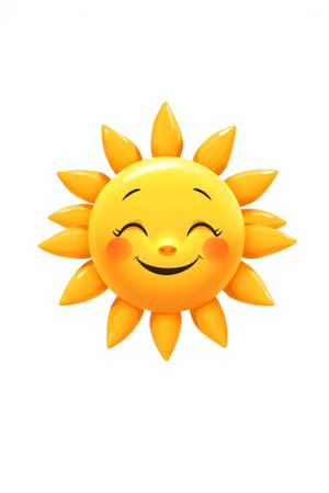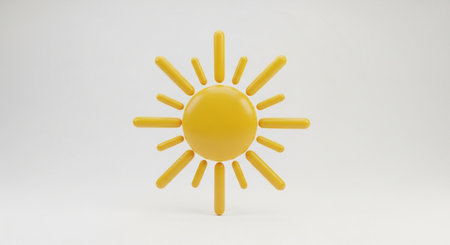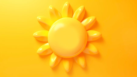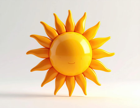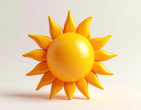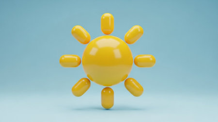 A stylized 3D yellow sun with rounded rays, depicted against a soft light blue background.